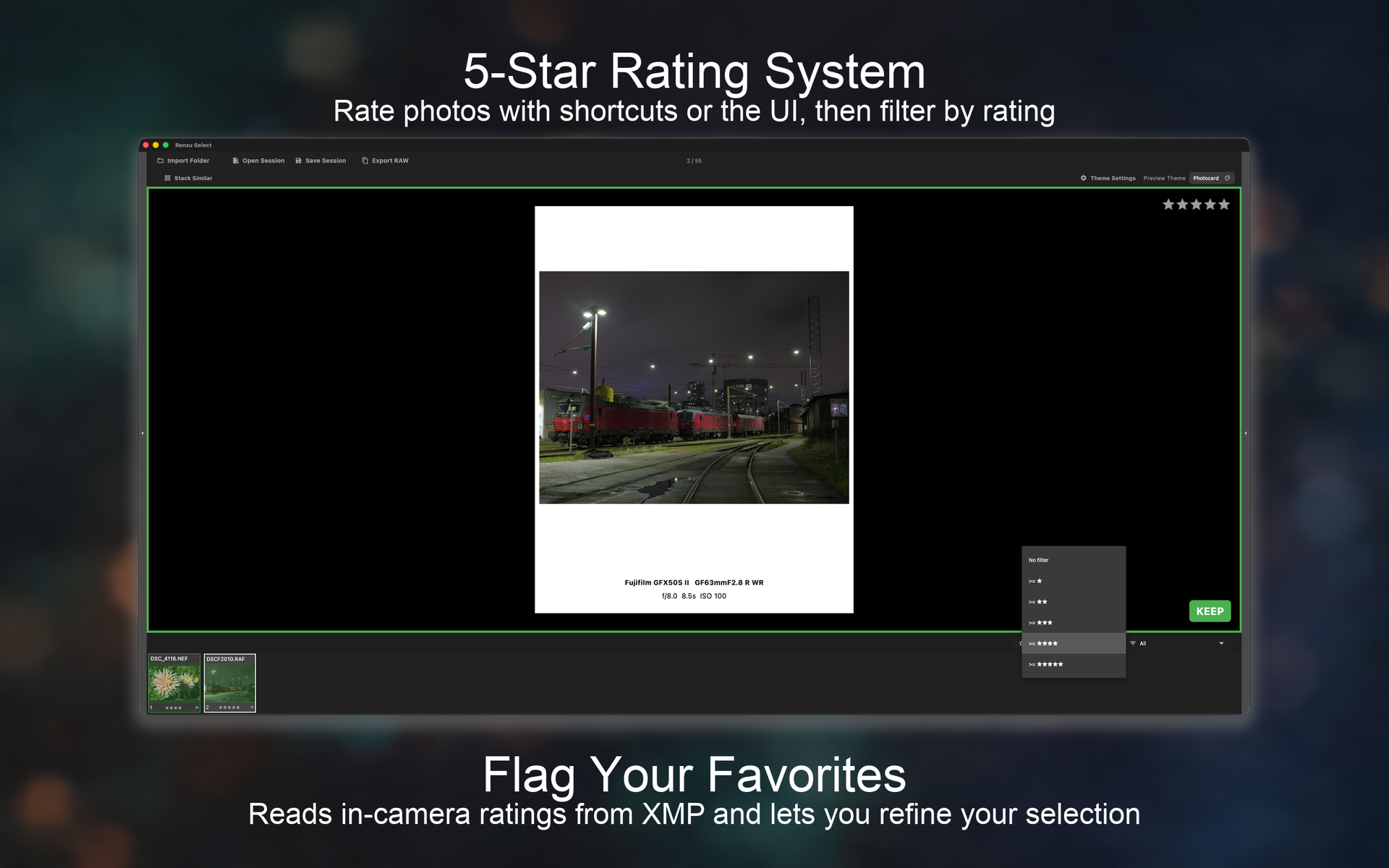 Rate photos instantly with shortcuts or UI. Filter by rating, import in-camera ratings from XMP. Find your keepers faster.