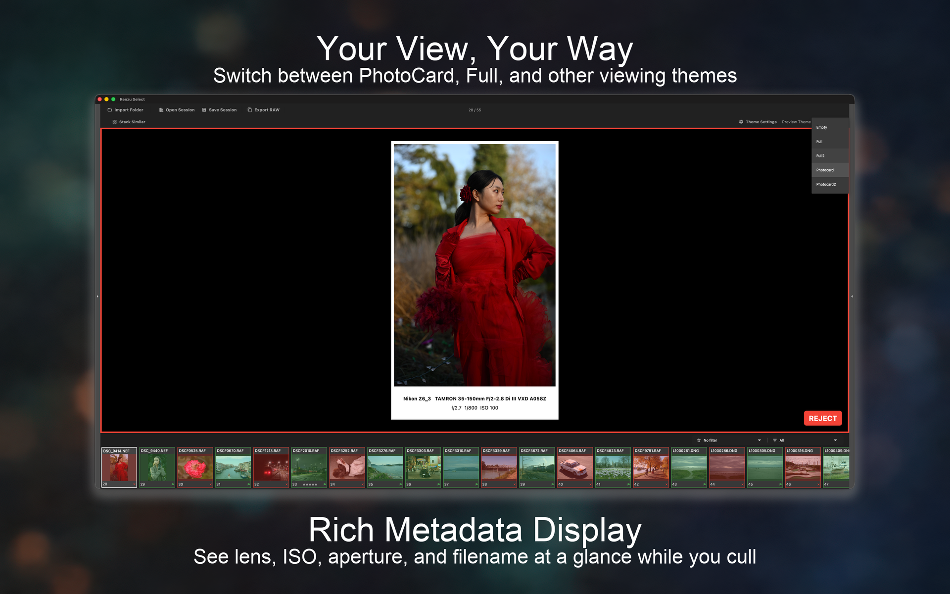 Switch between PhotoCard, Full, and custom viewing modes. Rich metadata display with lens, ISO, aperture at a glance.