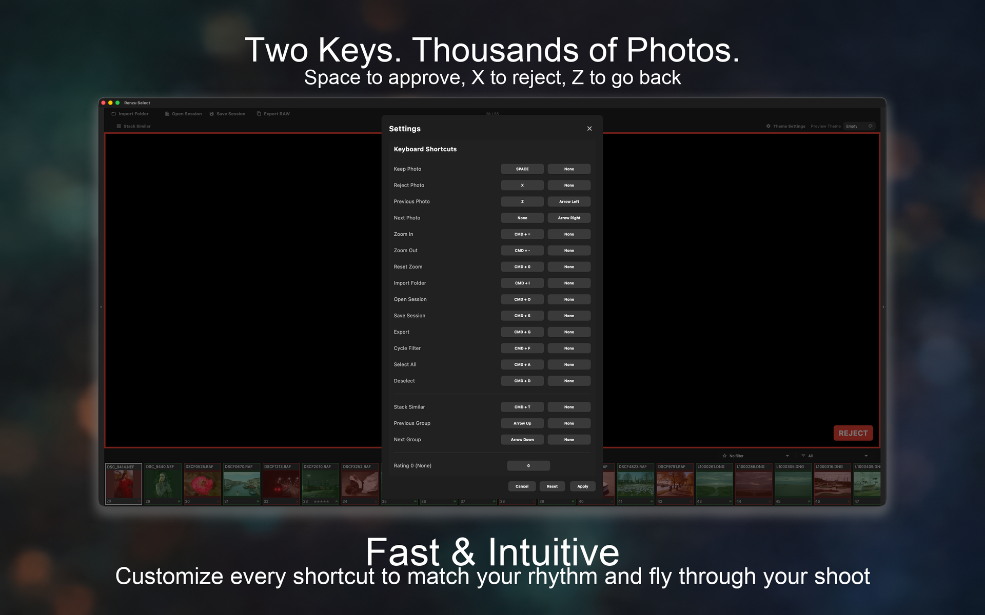 Space to keep, X to reject. Customize every shortcut. Culling becomes muscle memory.