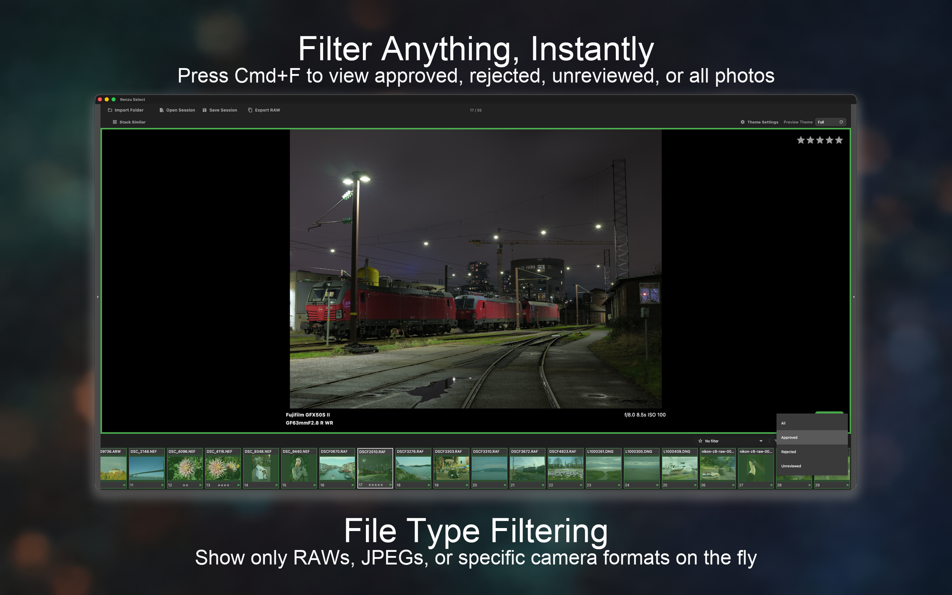 Renzu Select (formerly SwipeCull Desktop) helps you breeze through thousands of RAW photos in minutes with 100% local AI. Smart Stacking automatically groups similar shots, while you mark keepers with a tap, rate with 5 stars, and export with professional naming. Your photos never leave your Mac — no cloud, no subscriptions, no ads.