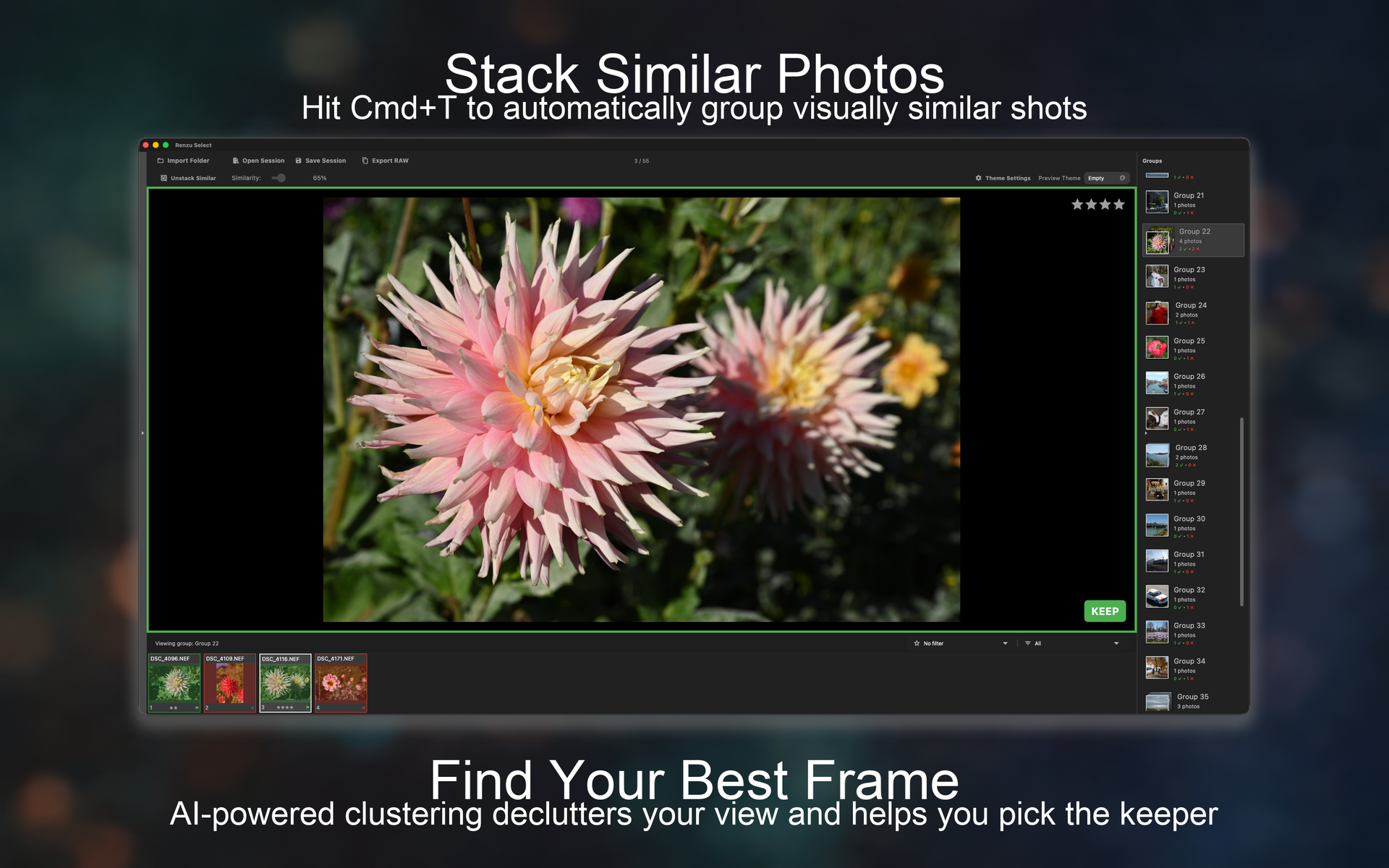 Hit Cmd+T to group similar photos automatically. 100% local AI — your photos never leave your Mac. Pick the best frame in seconds.