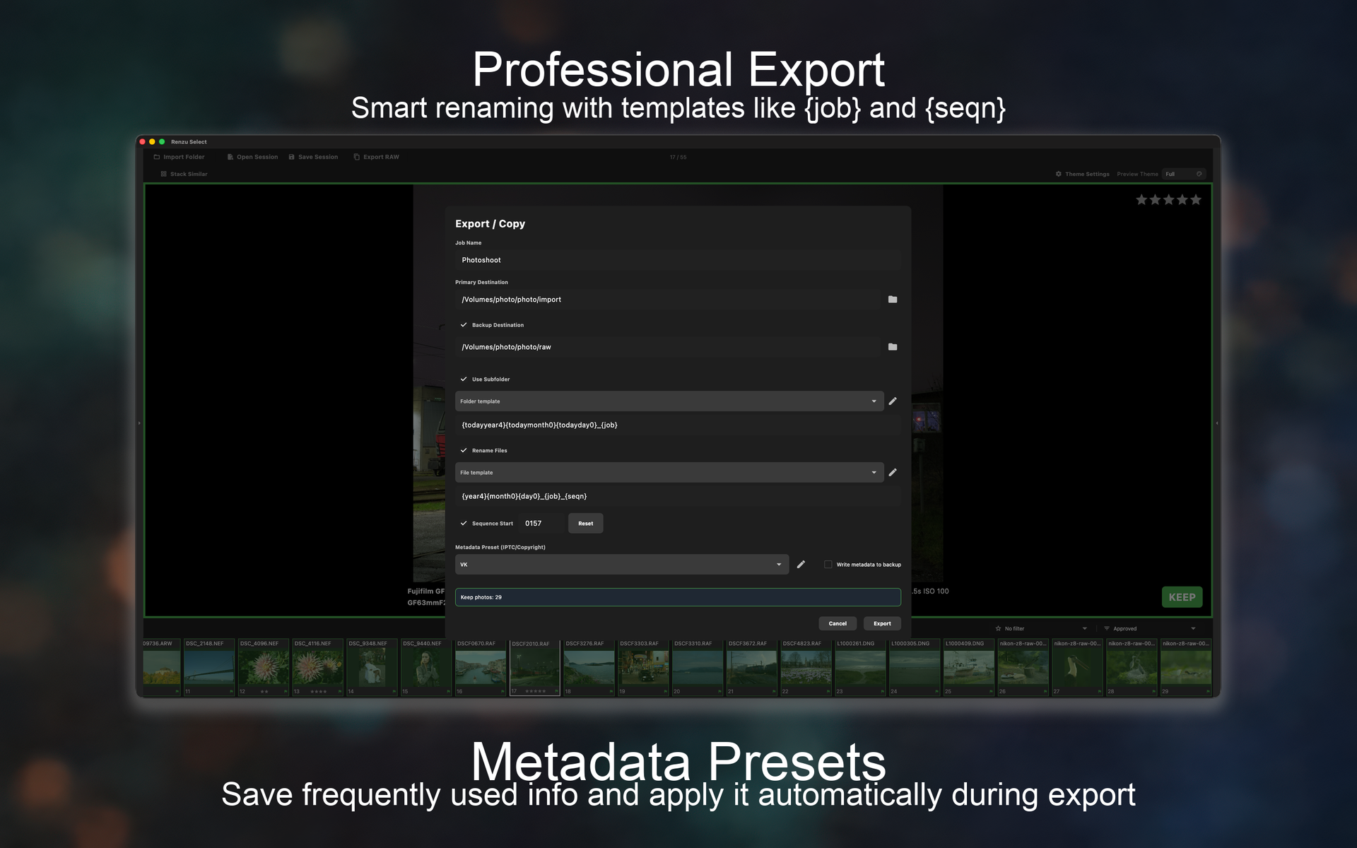 Smart folder and file templates. Primary and backup destinations. Metadata support.